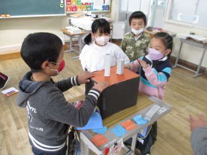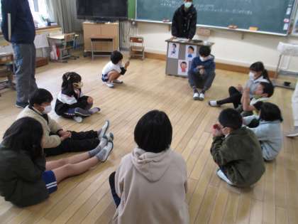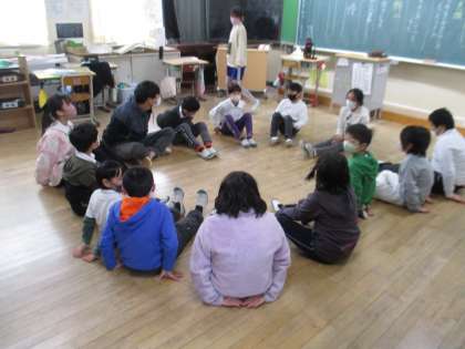 今日は縦割り班遊びの日でした。それぞれ「紙ずもう」「人狼ゲーム」「ハンカチ落とし」で遊んでいました。今日は室内での遊びでしたが、みんなとても楽しそうでした。