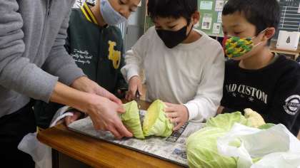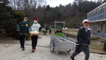 収穫した野菜をリヤカーなどで教室に運んだ後、おすそわけするために適当な大きさにカットしました。どれも新鮮でとてもおいしそうですね。