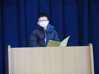 冬休み前集会の前に各学年の代表者によるスピーチがありました。友達のことやペットのこと、米作りを頑張ったことなど、みんなに伝えたいことを堂々と発表することができました。