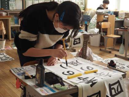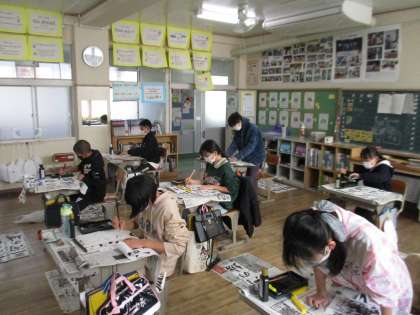 学年が上がると書く字も難しくなってきます。子どもたちは、とめやはらい等の細かい部分も意識しながら1枚1枚丁寧に書いていました。