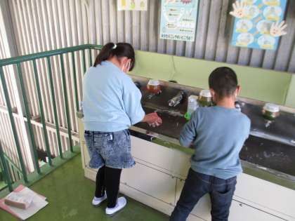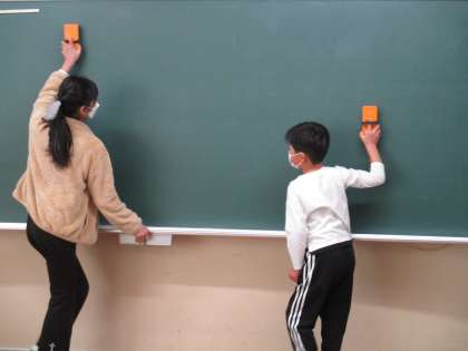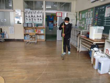 新しい担当場所を決めた後、早速掃除にとりかかりました。上の学年の子が下の学年の子にやり方を教えながら掃除をしていました。