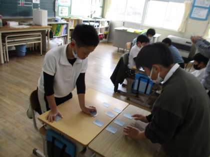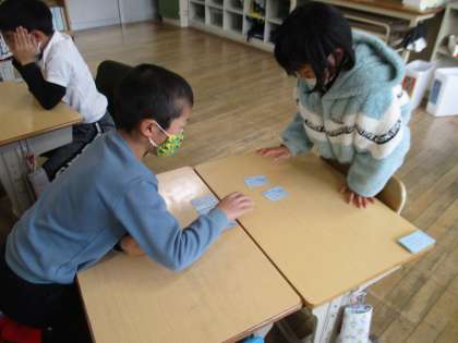 3年生の国語の授業の様子です。五色百人一首(青色の17首)に取り組んでいました。