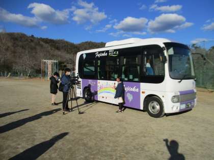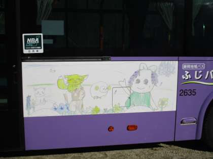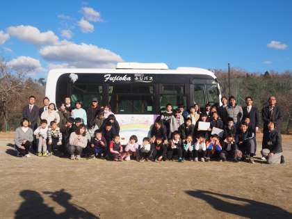 夏休みの自由応募で描いた絵が地域バスにラッピングされるということで、そのお披露目会がありました。選ばれた2人の4年生の子がバス会社から表彰していただき、自分が描いた絵の説明をした後、バスの前で記念写真を撮りました。最後は、全校児童と関係者がそろって記念撮影をしました。このラッピングバスは明日から運行されます。このラッピングバスを見た人たちがたくさんバスを利用してくれたら嬉しいですね。地元のケーブルテレビや新聞社による取材もありました。