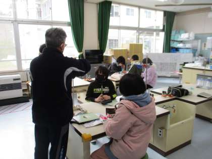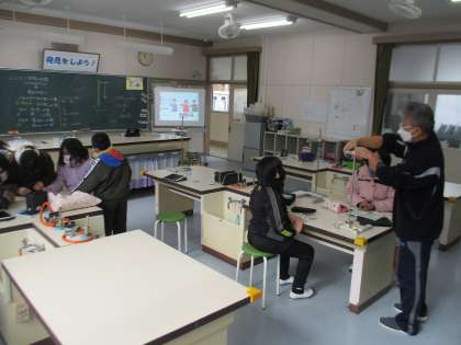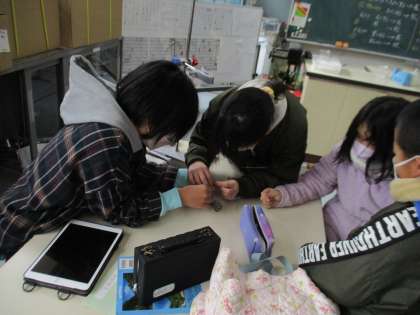 5年生の理科の授業の様子です。今日は振り子の学習をしていました。振り子となる5円玉に糸を通すことに苦戦していました。