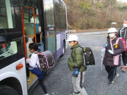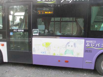 下校時の様子です。バス通学の子たちが利用するふじバスには、本校の4年生児童2人が描いた絵がラッピングされていました。