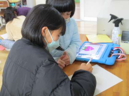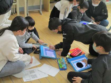 6年生が1年生の問題作りを手伝っていました。6年生のおかげで、1年生も英語が大好きになりました。