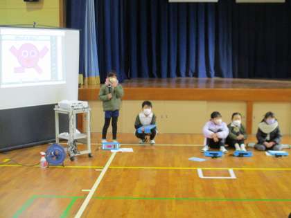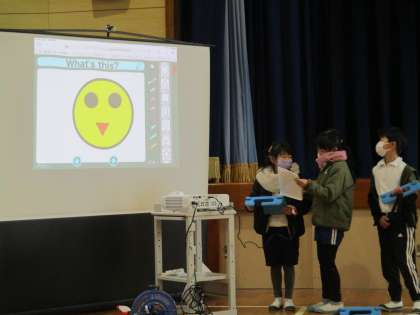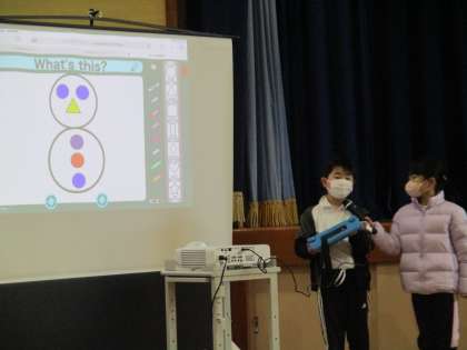 次の2年生3人の英語クイズの様子です。何の形か分かりますか?