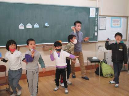 次に紙飛行機で遊びました。よく跳ぶ紙飛行機の折り方を教えてもらい、自分たちで折った紙飛行機を教室の中で飛ばしました。くるくる回ったり、自分の方に戻ってくる紙飛行機などがあり、みんなで笑い合いながら楽しく遊びました。