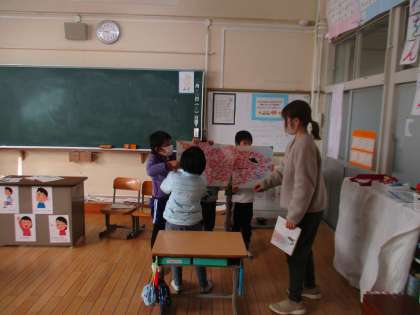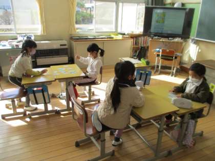 1年生は学習発表会の練習、2年生は5色百人一首、4年生は算数の学習にそれぞれ取り組んでいました。
