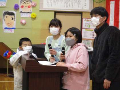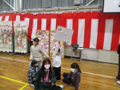 次に5年生の企画による「6年生クイズ」を行いました。1問目は、ある6年生の子が好きな給食のメニューを当てるというクイズでした。「からあげ」と「カレー」という答えが多かったですが、果たして答えはどちらだったでしょうか?