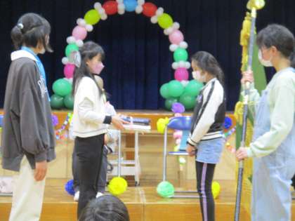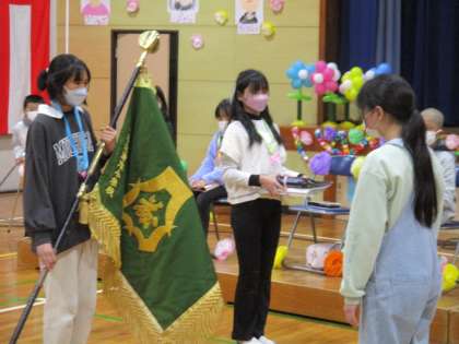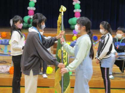 次に、6年生の代表から5年生の代表に、校旗と縦割り班ファイルの引継ぎをしました。