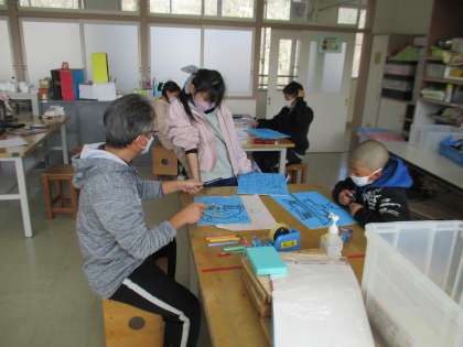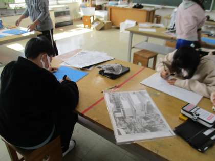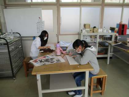 6年生の図工の授業の様子です。修学旅行の1コマなど、自分の思い出に残った場面の木版画に取り組んでいました。