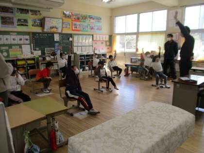1・2年生がALTと一緒に楽しく英語を学んでいました。今日は、ALTが英語で3つのヒントを出して、その答えを日本語か英語で答えるという内容でした。とても盛り上がり、みんな楽しそうでした。