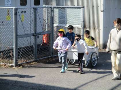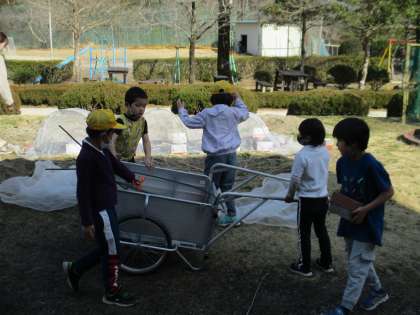 1年生が畑の片づけをしていました。みんなでリヤカーを倉庫に取りに行き、畑のシートなどを外してリヤカーで運びました。みんなで協力してきれいに片づけることができました。