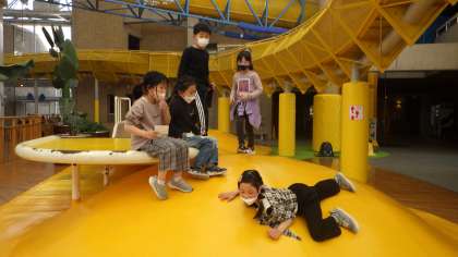 モリコロパークに到着すると、まず児童総合センターで体験学習をしました。館内にかくれている文字を探したり、遊具で運動したりしました。