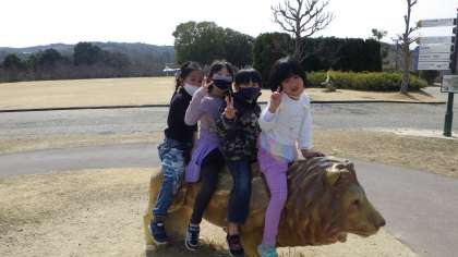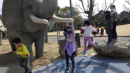 食事の後は、自由時間です。大きな象にぶら下がったり、動物の背中に乗ったりして楽しそうに遊んでいました。