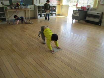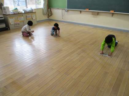 1年生の大掃除の様子です。1年間お世話になった教室をきれいにしようと、一生懸命にそうきんで床を拭いていました。みんなとてもよく頑張りました。後から、先生がワックスがけをしました。
