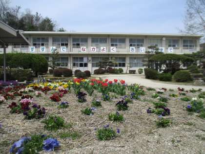 桜坂の桜と校舎の風景写真です。すっかり春めいて、桜は満開を迎え、花壇のチューリップもきれいに咲いています。令和4年度も、保護者の皆様、地域の皆様のおかげで、子どもたちは大変充実した一年を過ごすことができました。本当にお世話になりました。令和5年度の御作小学校も、どうぞよろしくお願いいたします。