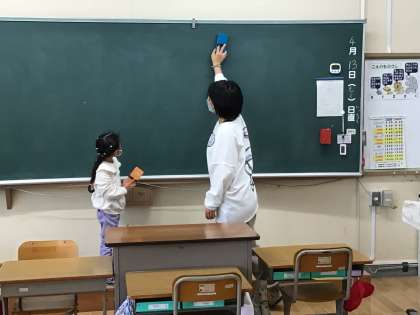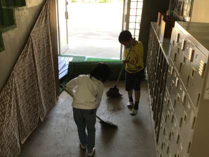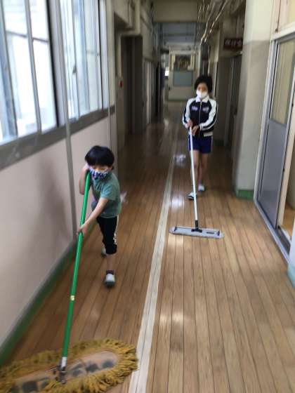 上の学年の子が1年生の子に寄り添いながら掃除をしています。