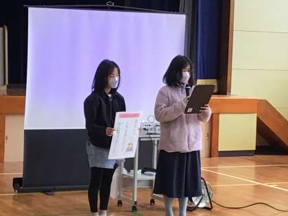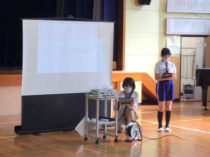4月17日 児童集会 公開日 2023/04/17 更新日 2023/04/17 お知らせ まず、前期任命式を行いました。任命状を受け取るときに「ありがとうございます」と言って受け取ってくれるので「頑張ってください」と伝えました。今日から司会等を立派に務めていました。 元気集会からはかがやきカードのこと、ミュウジックアナウンス委員会からは挨拶についてお話がありました。タブレットのパワーポイントで話す内容をまとめて発表してくれました。 みんな真剣に聞いていました。