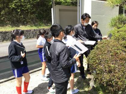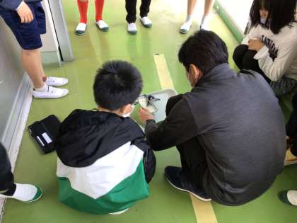 十姉妹が校舎に飛び込んできて、窓ガラスに激突してしまいました。それを見た5年生の子たちが心配して、外の垣根に運んでくれることになりました。