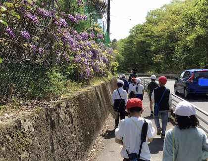 公園でお世話になった地域の方とお会いして挨拶をしました。御作小学校の児童の絵を書いてくださった壁面をバックにして、全員で写真を撮りました。藤の花を見ながら、元気に学校に戻ってきました。