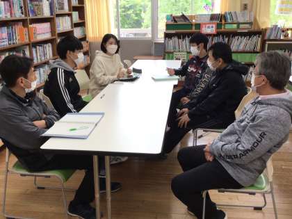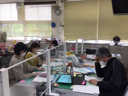 御作小学校の授業形態の確認とICTの有効な活用方法について、話し合っています。