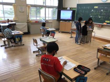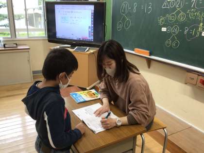 解けたら、担任の先生のところに行き、丸をつけてもらっています。