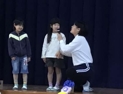 1年生の子たちが2年生の子たちに誘導されて舞台へ、そして、6年生の子たちに名前や好きな食べ物や好きなゲームを聞きました。しっかり答えていました。