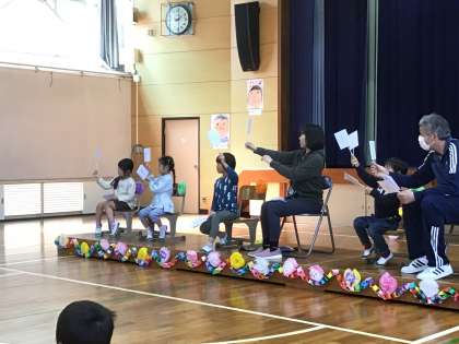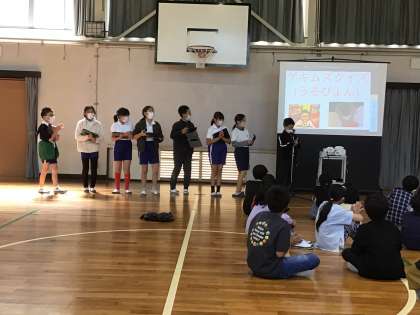 5年生がタブレットで御作小学校クイズを出してくれました。解答を出すまでのカウントダウンがユニークでした。なかなか難しい問題もありましたが、1年生の子たちは頑張って解答の札を出していました。