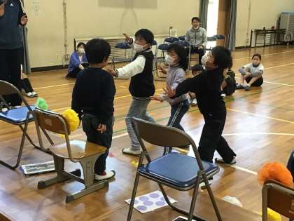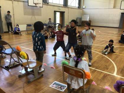 3、4年生の子たちは、首飾りをかけるだけでなく、1年生の子たちを笑顔にするパフォーマンスもしていました。