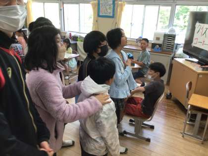3、4年生の子たちが育てたいちごについて学習したことを6年生に伝えました。