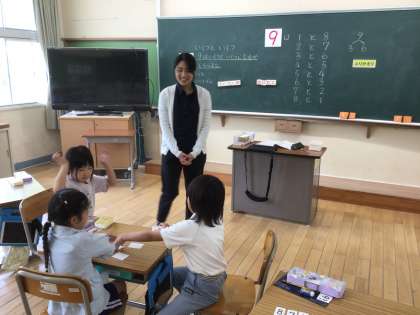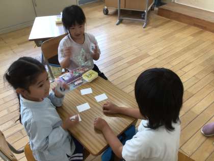 いくつといくつで9になるかを学習した後に、トランプの神経衰弱の方法で9になるペアをひっくり返していました。楽しく確認ができました。