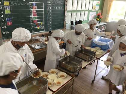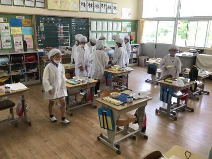 全員で配膳を素早く行っています。 上手に全部配っていました、。