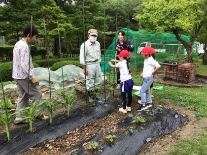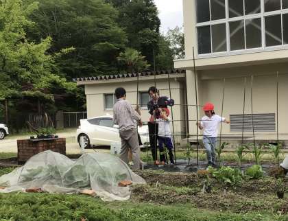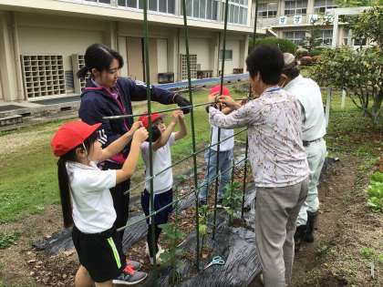 野菜が大きくなってきたので、地域講師の方に教えていただきながら、支柱を立てました。