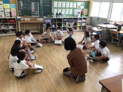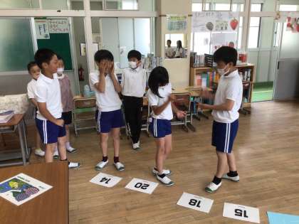 1から21までの数字を言う「English music」を歌い、その後、数字のカードを一人一枚持って、「English music」に合わせて、数の英語を言ってカードを上げることをしていました。曲が速いので素早く上げなくてはいけません。