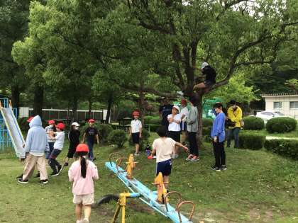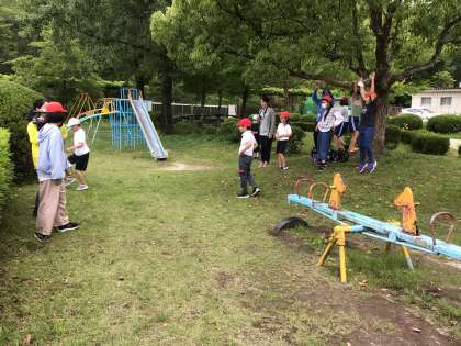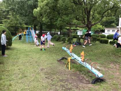 1、2班がグリーンベルト近くで、缶けりをして遊びました。