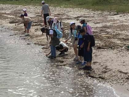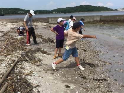 石を投げてジャンプさせたり、生き物がいないか見ていたりしています。