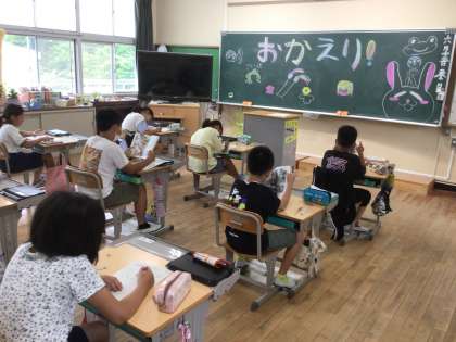 5年生が帰ってきたら、黒板に「おかえりなさい」を書いて、迎えてくれました。
