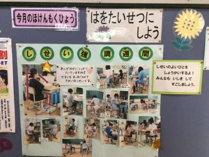 姿勢強調週間で、姿勢の良かった子の写真が掲示されています。