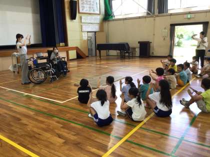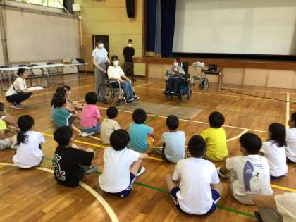 段のあるところでは、小さいタイヤをくっつけてから、後ろにあるペダルのようなものを踏んで、「前のタイヤを上げます」と声をかけてから、段に乗せます。後輪は少し力を入れてあげます。