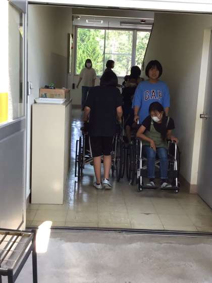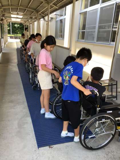 5、6年生は、学校の施設で車椅子の扱いをためしました。廊下をすれ違うのも案外狭いです。常日頃、坂になっていることを感じていないところが坂だと感じます。ドアの少しの障害物が乗り越えにくいです。障害はいたるところにあります。