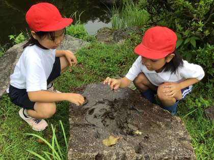 ビオトープのところで遊ぶ子もいます。ザリガニを見付けました。