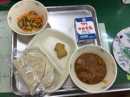 今日の給食の献立は、カレーナンです。