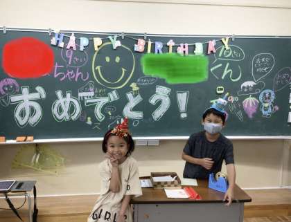 夏休み中に誕生日を迎えた3・4年生の2人のお祝いメッセージが黒板いっぱいにかかれていました。