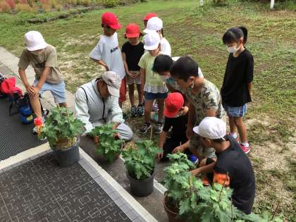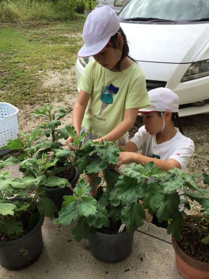 子どもが「枯れた葉っぱはどのように取ればいいですか」と聞いたら、「茎に沿って下に引っ張ると傷つけずに上手に取れる」と教えてもらいました。