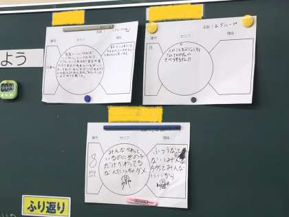 途中で、グループに分かれて、投げかけるセリフとその理由を考え、発表しました。