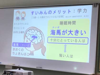 しっかり寝ると海馬が大きくなって、記憶力が上がり、勉強ができるようになるということです。