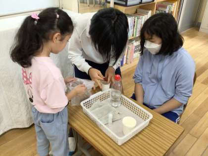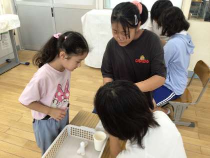 1年生の子たちが生活科の学習で学んだ色水づくりを6年生の子たちに説明して、6年生の子たちが実際に色水を作りました。
