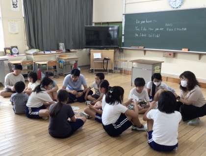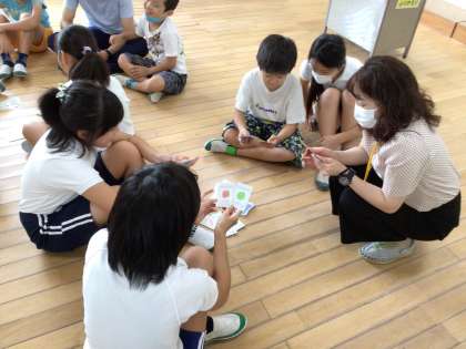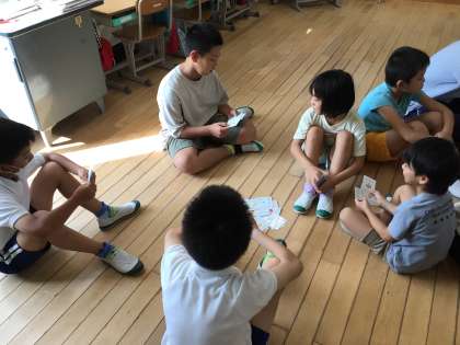 2、5年生が「Do you have ~? Yes,I do. Here you are.」のような英語を使いながらカードゲームをしました。